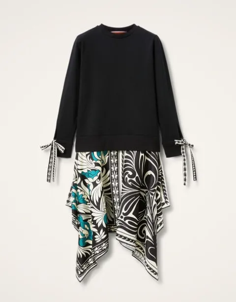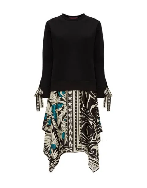 A dress that styles itself, what could be more alluring? A silhouette of two halves, the Arcade comprises a soft jersey sweatshirt up top, which falls to a fluid and flirty foulard miniskirt. Never too casual, never too chic, its understated comfort is glamorously met with this spectacular hand-placed Tiles print and little details like silk ties around the cuffs. Super cute for the weekends with wool socks and sneakers or dial things up for night with your favorite knee-high boots.
