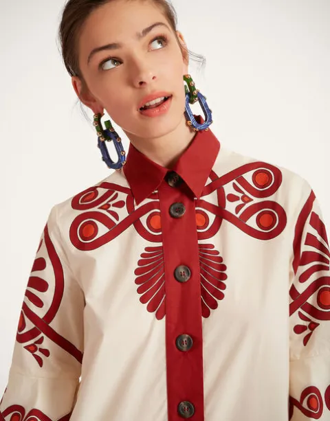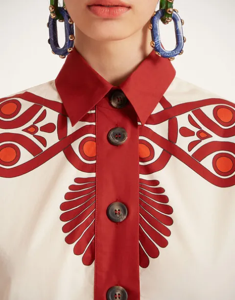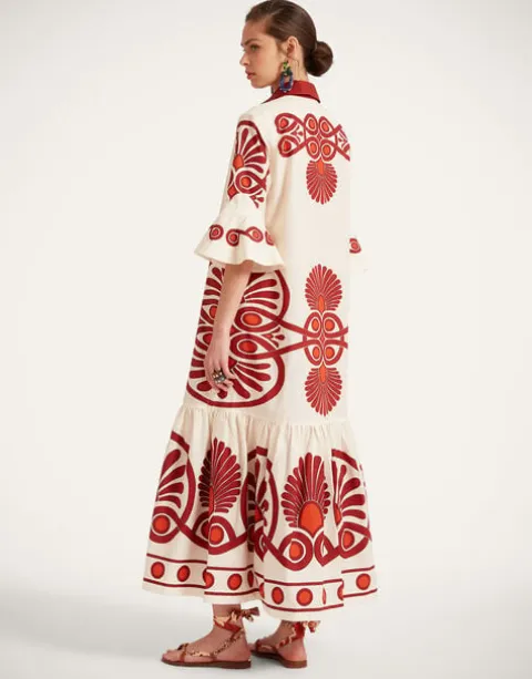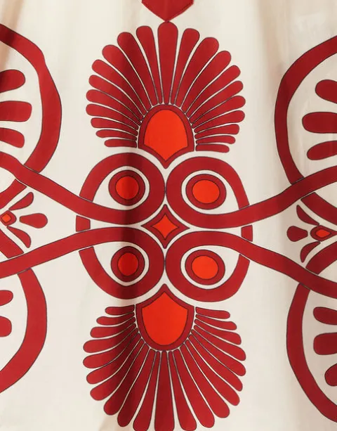 We’re big fans of evening drama, and our Artemis Dress brings it. We’ve cut it in a voluminous shape for added wiggle room and comfort and given it a frisky touch with a pointed collar and frilled sleeves. Cut from cotton poplin, it’s light and airy and not stiff at all. Its namesake was the Goddess of the Moon, so we’ve pumped it up with a big frilled hem and hand-placed Medallion print for those moonlight summer dance parties.