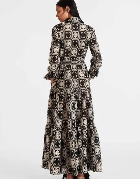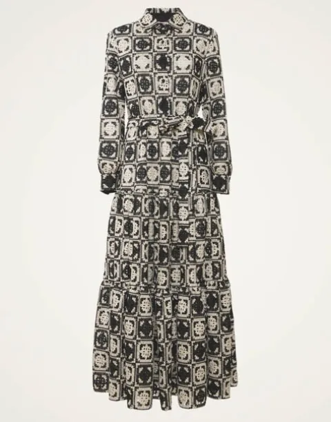 Bring back boho! Our whimsical Bellini Dress returns for another season crafted in this intricate macrame knit to bring a sultry vacation mood wherever you wear it. Its tactile fabrication is beautifully offset by its snappy collar and flowing three-tier skirt, and it comes with a removable belt which you can cinch for more waist. Romantic and really ravishing, wear it for cocktails with heaps of gold jewelry and a vacation glow.