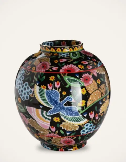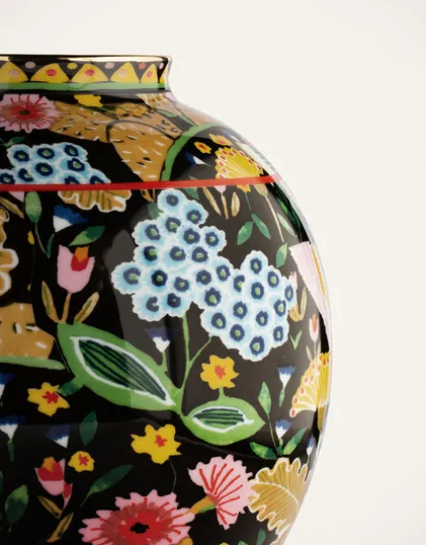 Historic Verona-based porcelain maker Ancap were the masters behind this exquisitely printed porcelain vase, which features 18K gold trim, contrast decorative lining and supersaturated colors. The vintage pattern was cut into strips and placed in three different segments so that it could completely cover the round porcelain base and still look totally fabulous. The contrast-colored belly band and gold trim were hand-painted by the most kick ass artisan hands. Contrasting motifs were also designed on the vase’s neck band.
