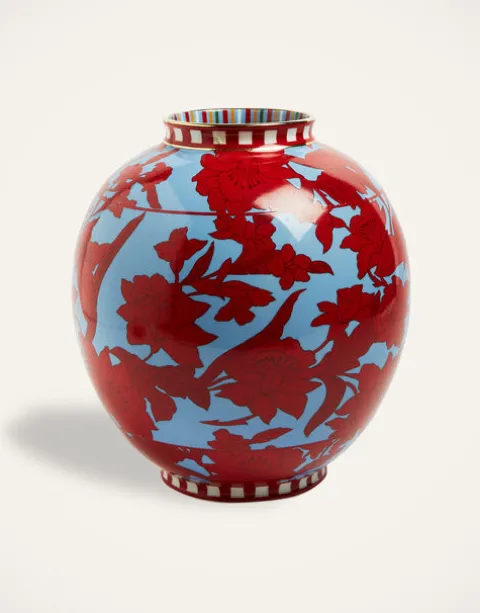 Our statement printed porcelain vase comes crafted by Italy’s finest porcelain artisans, and features supersaturated colors, hand painted details and a divine 18K gold rim. We love its extra-big bellied form, and see that contrast pattern at the rims? It makes our abundant floral Lilium print positively zing. Whether you fill it with fresh cut blooms or style it solo, this beauty is a centrepiece, and then some.