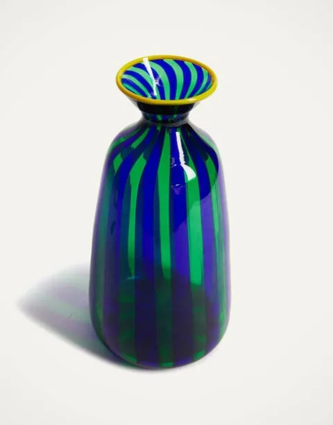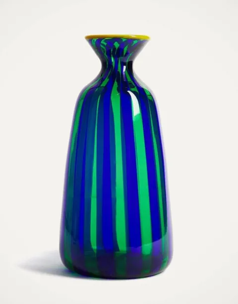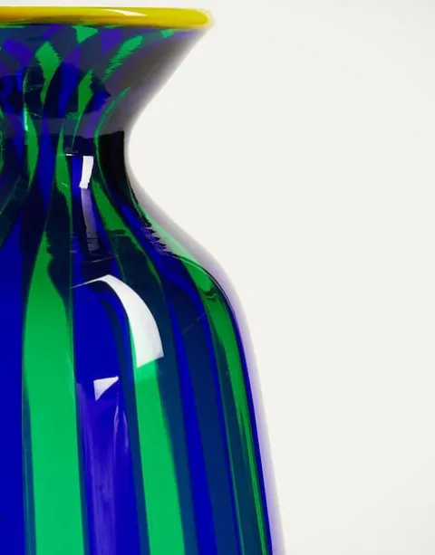 Crafted by our iconic Venetian partners, the Salviati glass masters, this candy-striped statement vase is equal parts electric and elegant. Every vibrant vase is crafted from hand-blown Murano glass, featuring all the unique signs and marks of its artisanal production that make each piece one-of-a-kind. With a slender shape, this smooth, truly unique design is as perfect filled with peonies as it is used as a water carafe for your latest greatest aperitivo party.