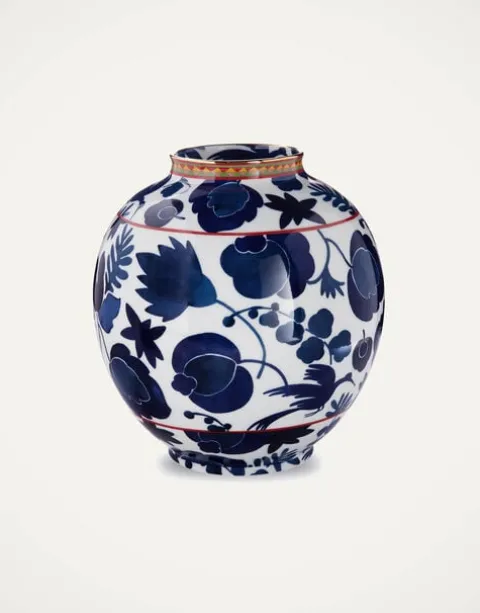 Historic Verona-based porcelain maker Ancap were the masters behind this exquisitely printed porcelain vase, which features 18K gold trim, contrast decorative lining and supersaturated colors. The vintage pattern was cut into strips and placed in three different segments so that it could completely cover the round porcelain base and still look totally fabulous. The contrast-colored belly band and gold trim were hand-painted by the most kick ass artisan hands. Contrasting motifs were also designed on the vase’s neck band.