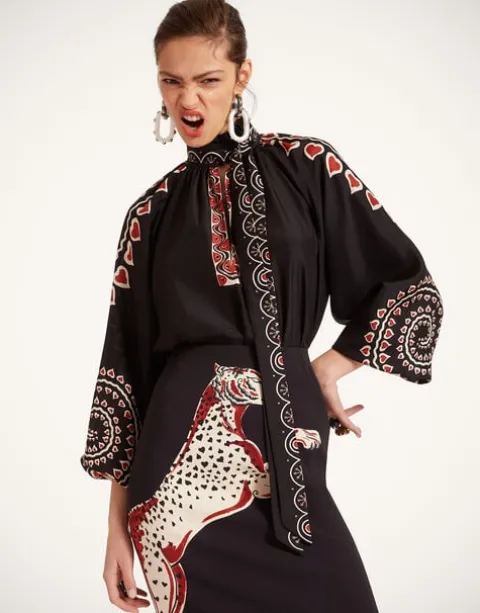 There’s nothing like a little romance to zhuzh up your wardrobe separates. Light, beautiful and unapologetically feminine, the Cerere Blouse is one for your admirers to fall in love with. Its vintage-inspired shape appeals to our whimsy side and is finished with a detachable foulard at the collar that can be tied, styled as a belt or let loose. Crafted in fluttery crepe de chine silk and arriving in our vintage inspired Fans print, hand-placed for a luxury effect.