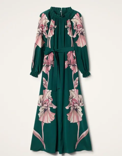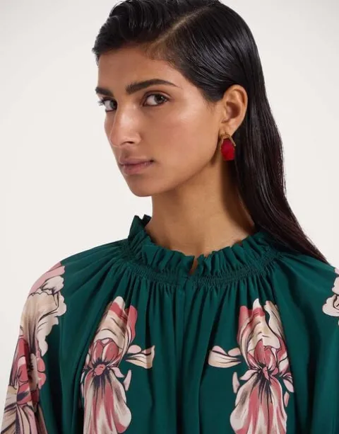 Named after the goddess of abundance, the gorgeous Cerere Dress brims with color and romance. Crafted from ultra lightweight silk voile that drapes like a dream, this floor-sweeping bella has an airy silhouette that can be cinched at the waist with removable sash if more shape is your thing. We love the romance in the little details – buttons at the neck, ruffle collar, puff sleeves – plus this gorgeous dark floral print hand-placed by our Italian craftspeople.
