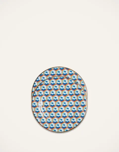 Part of our ravishingly retro collaboration with 1stDibs, this set of two Dessert Plates arrives in a vintage geometric print crafted from fine porcelain by our historic Italian partners, Ancap. The 1stDibs collection offers six different color combinations built in mix ’n match maximalism, or use this set to add a jolly jolt to your white tableware at home. Finished with 18k gold trims, these plates do double duty, so snag a few for your salad course or dot around as a handy spot for keys or crystals as well.