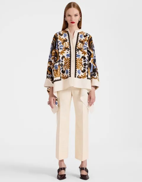 The best-selling LDJ Foulard Shirt has become such a spring and summer staple, we simply had to develop a design for fall. Enter the Foulard Jacket, same bohemian scarf silhouette and all-figure flattering drape, this time in exquisite jacquard, crosstitched with our Corsini print inspired by the Renaissance. Lightweight but structured, this beauty can be left open as a jacket, closed as a top, and can transition from July sundowners in Capri to October adventures through Umbria.