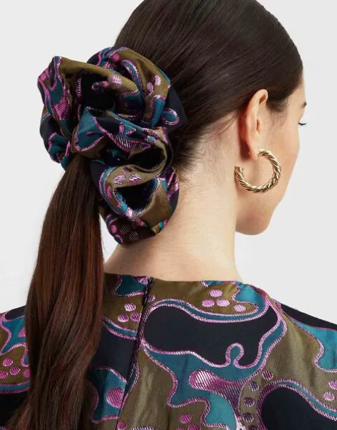 Our biggest hair scrunchie just got a double dose of drama done in opulent jacquard to see you through the party season top to toe in style. Mix and match with our fabulous gowns and knitwear if that’s your kinda thing or tie it around your pony for a feel good flourish from your yoga shlep to cocktails.