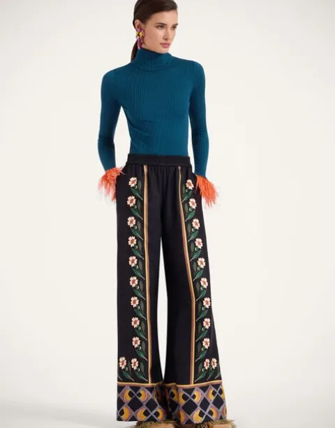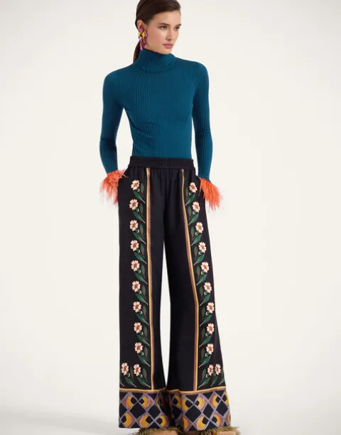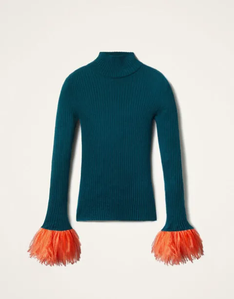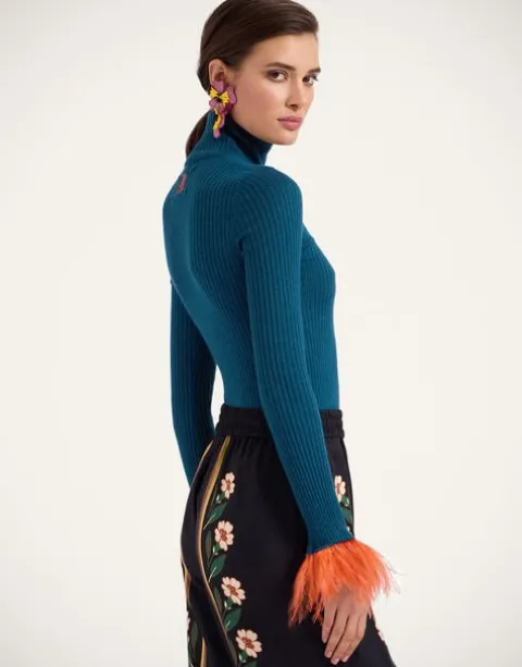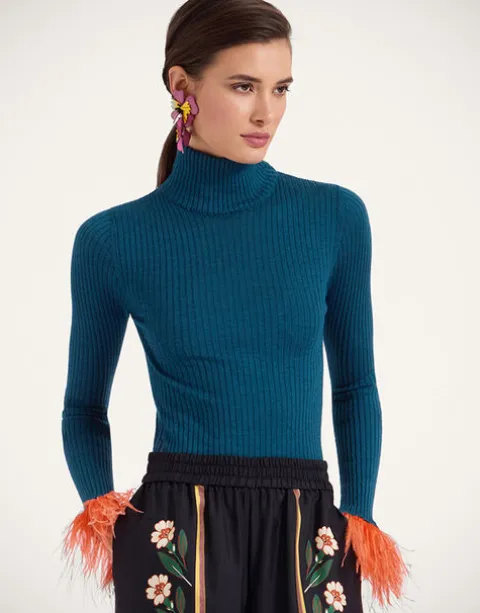 In true Italian style, we like to add a little extra joy jolt to all the clothes we create – here, we’ve taken a classic solid turtleneck shape and woven it in a sumptuous silk-cashmere blend, before trimming each cuff with a plume of feathers. Slim through the chest and shoulders and wide along the base to create an hourglass shape, this is a super flattering wardrobe staple, fabulous alone but extra elegant under a 24/7 Jacket with just the feathers peeking through. Consider it a happy high-kick to the heart.