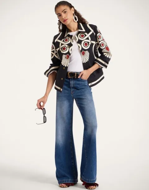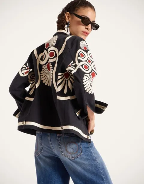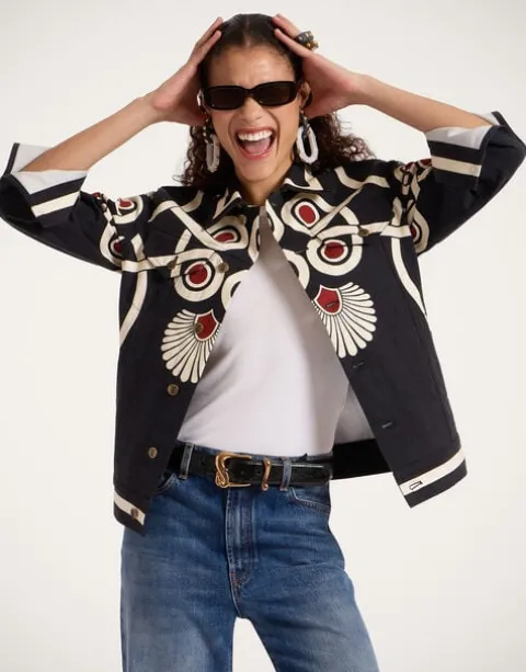 You know we mean business when we put J.J.’s name on a piece. This jacket has so much joy sewn into the seams, we’re wearing it all year long, over jeans, over dresses, paired with our dynamite new denim Mini. Oversized enough to have that covetable “lived-and-loved-in” look, this is an elevated take on the every day, with hand placed prints in sophisticated color ways, and custom buttons embossed with our new Yang emblem. Apologize to your other jean jackets for us – I’m afraid they’ve been replaced.