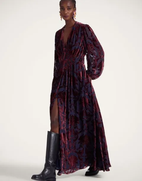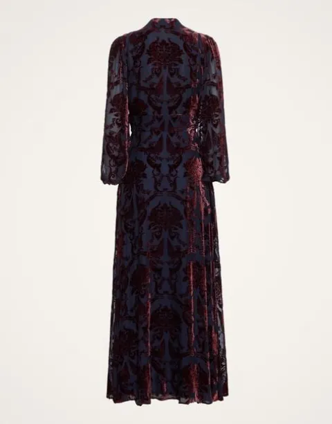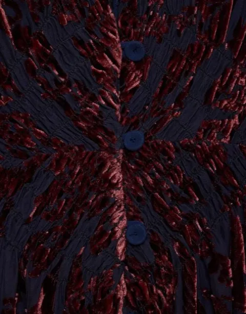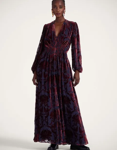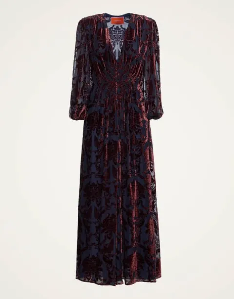 Our favorite summer silhouette, the Camerino, has been elongated to elevate your fall. With intricate and universally flattering elasticated smocking below the chest and across the waist, you’ll be supported in all the right places. Designed for daydreams, this piece is all about personalization – buttons that run all up the front of the dress can be undone to your desired level of va-va-voom while voluminous sleeves end in an elasticated cuff to be slipped up amplify those high-drama wings. Dazzling during the day, but easily amped up for the night-time in this luxurious devoré velvet, we’ll be living loud and happy in this beauty all season long.
