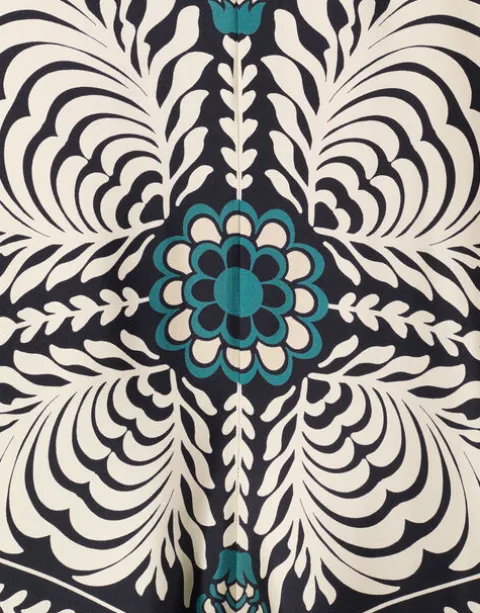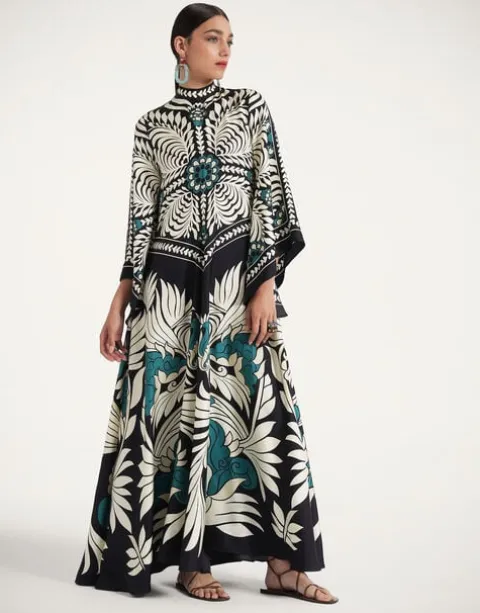 Shouldn’t every babe have a dress called the Magnifico hanging in her closet? La DoubleJ believes so! With a stand-up collar, long sash at the back and draped waterfall sleeves, this special number will glide you around the room with an ease and an elegance reserved for the most exclusive of occasions. Cut in Como-made silk it arrives in this beguiling hand-placed print brimming with mystique and allure, destined for a decadent palazzo party and perfect for mediumalists and maximalists alike.