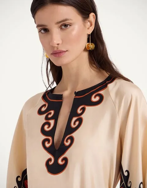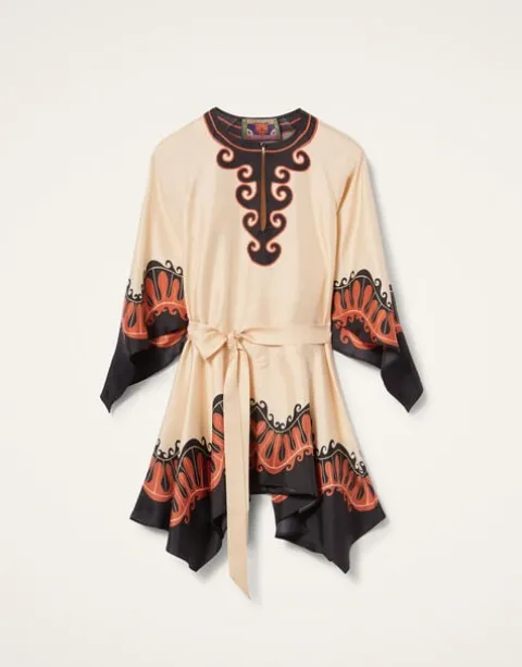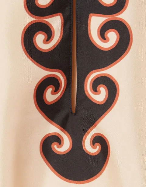 This dress might be the perfect encapsulation of our collaboration with L.A.-based design brand, Mother, with its easy-breezy California cool-kid energy, and maximalist Milanese romance. Crafted from the silk twill crafted on Lake Como featuring a print perfectly positioned by Italian artisans, it’s luxurious but also laid-back, with an irregular scarf-style hem and hidden pockets for utilitarian ease. She can be worn a multitude of ways – as a tunic top over pants, loose with bare legs, or belted for a super chic, hourglass shape.