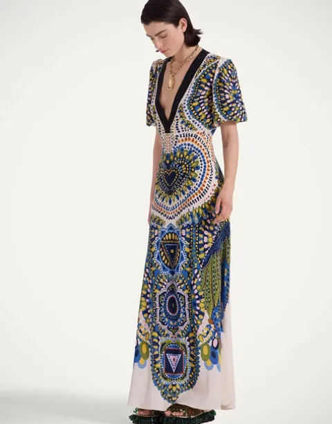 Sophisticated and sensual, this silhouette is as radiant as her namesake, the iconic Marlene Dietrich. The voluminous sleeves cinch in an elasticated cuff that can be pushed up to your desired level of oomph. An angle-length, lightly flared skirt is pure romance while the deep V neckline is pure vixen. Crafted from embroidered crepe de chine with a print meticulously placed by Italian artisans, she’s, perfect for stealing focus at your BFF’s wedding in Portofino.