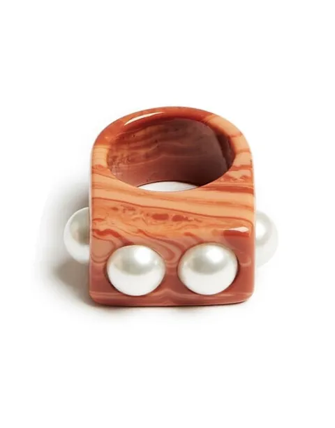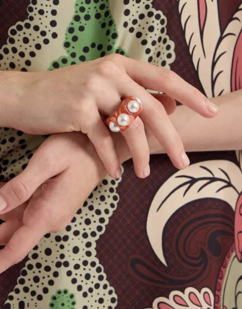 Crafted from solid coloured resin with statement pearls studding it’s edge, the Fawn Ring is bold, beautiful and totally badass. Whether you’re rocking it with a monochrome outfit or a print on print party, this design was destined to stand out. Treat her with care, that resin is precious.