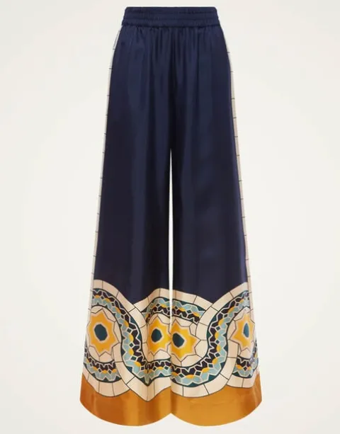 We cannot take credit for inventing the Palazzo Pant silhouette, but we will take credit for making them cool again. These trousers sit on the waist and fall flared, with a wide, breezy fit through the legs – like a skirt, but with the comfort of pants. Cut in our iconic silk twill from Lake Como, they arrive in this hyper sophisticated hand-placed Mudejar print that will glide you between all spring’s occasions with a chic shot of confidence and ease.