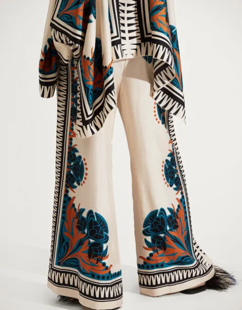 We cannot take credit for inventing the Palazzo Pant silhouette, but we will take credit for making them cool again. These trousers sit on the waist and fall flared, with a wide, breezy fit through the legs – like a skirt, but with the comfort of pants. With a woven texture and a lustrous hint of shine, they’re made in our fluid silk twill from Lake Como and arrive in this stunning print expertly placed by hand.