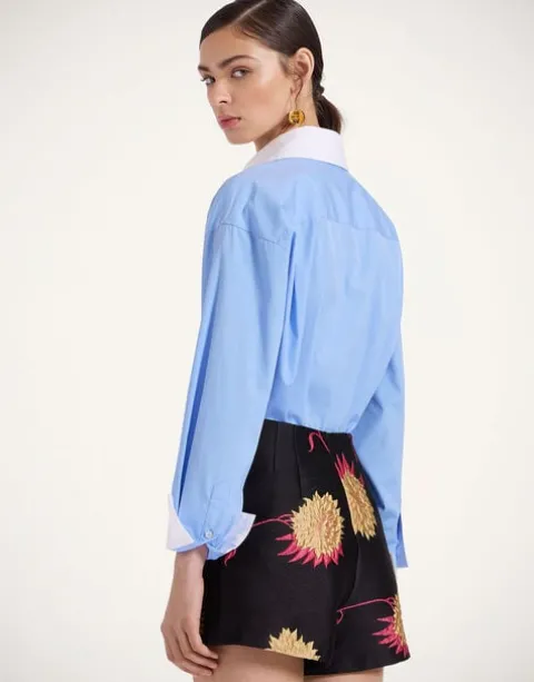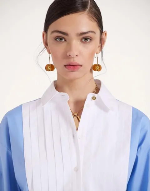 For the sophisticate with an artistic eye, the Peggy Shirt is exactly what we imagine the iconic collector Ms. Guggenheim would wear as she strolled through her gorgeous gallery in Venice. A slightly oversized take on a Tuxedo Shirt, we’ve added a boxy drop shoulder to this classic silhouette, and a high low hem for a more modern mood. Minimalists will love the two tone version, while those seeking a pop of punchy print can opt for the version with our playful geometric panel.