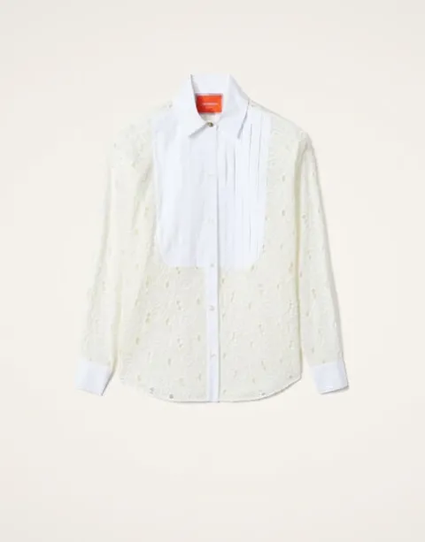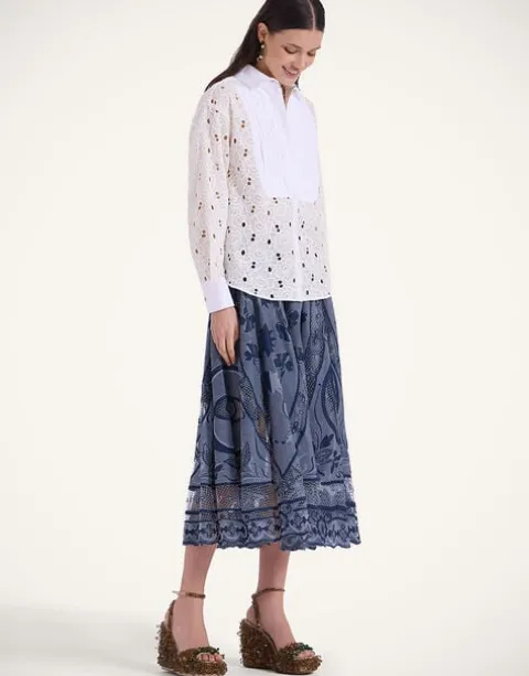 For the sophisticate with an artistic eye, the Peggy Shirt is exactly what we imagine the iconic collector Ms. Guggenheim would wear as she strolled through her gorgeous gallery in Venice. A slightly oversized take on a Tuxedo Shirt, we’ve added a boxy drop shoulder to this classic silhouette, and a high low hem for a more modern mood. Minimalists will love the two tone version or our solid take in luxurious ivory Sangallo, while those seeking a pop of punchy print can opt for the version with our playful geometric panel. Note the lucky charm on the button, our scarab spirit animal, which symbolizes growth and resurrection.