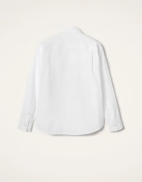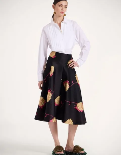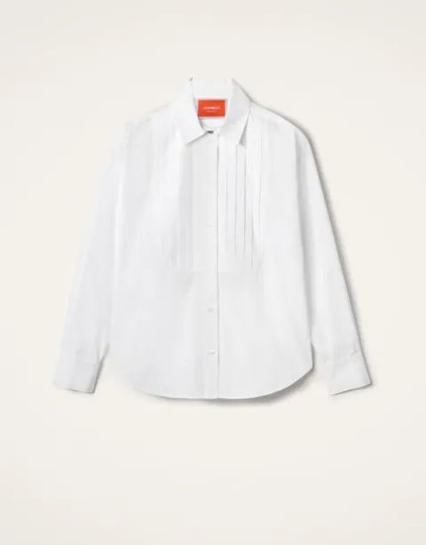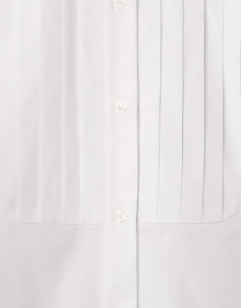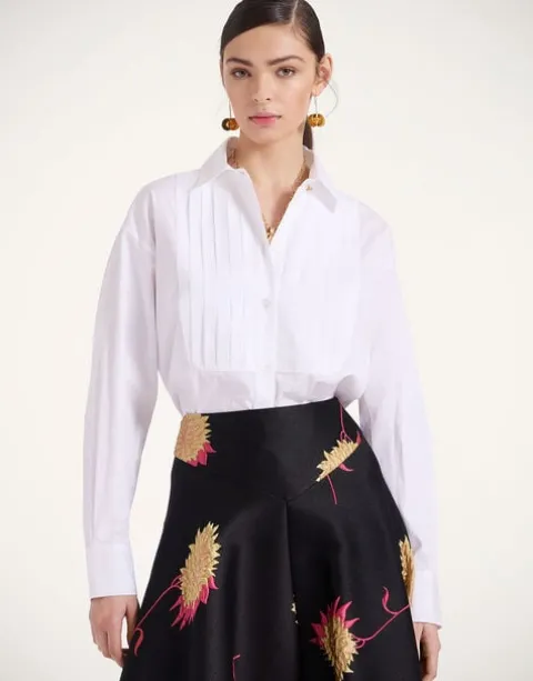 For the sophisticate with an artistic eye, the Peggy Shirt is exactly what we imagine the iconic collector Ms. Guggenheim would wear as she strolled through her gorgeous gallery in Venice. A slightly oversized take on a Tuxedo Shirt, we’ve added a boxy drop shoulder to this classic silhouette, and a high low hem for a more modern mood. Minimalists will love the two tone version, while those seeking a pop of punchy print can opt for the version with our playful geometric panel.