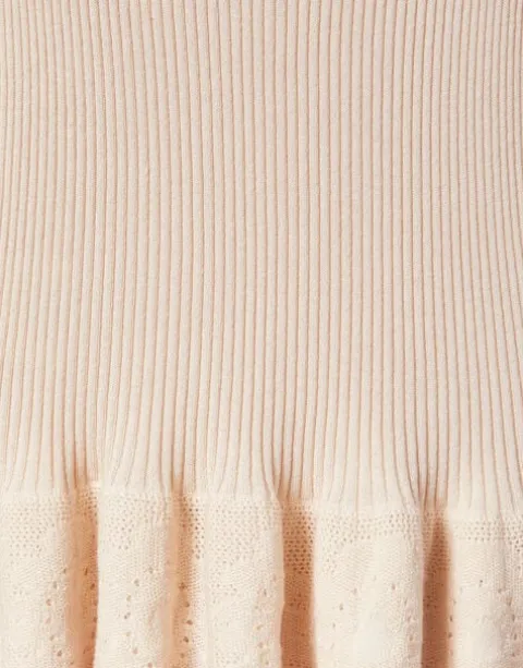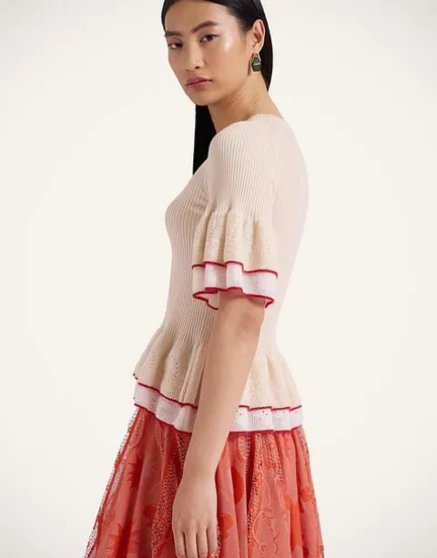 A sophisticated spin on the spring sweater, this ribbed knit tee arrives with romantic peplum ruches along the cuffs and hem, and a contrast color lace trim to give a little extra Italian flair. Wear it with one of our pencil skirts or your favourite LDJ denim for an effortlessly elegant 9-5 look.