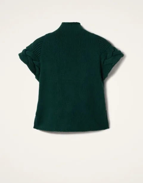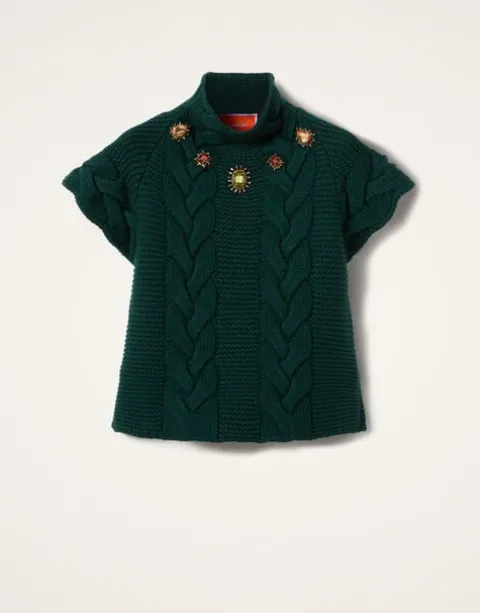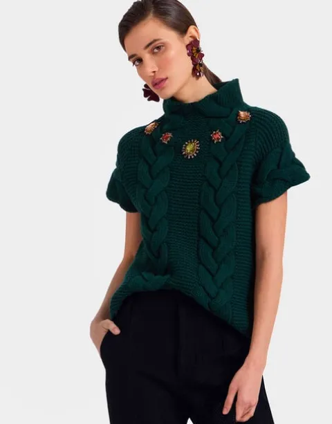 Just like our Portrait Sweater, this knit kit essential has chic, chunky braids down the front and across the shoulder, but this time with short sleeves and a romantic high neck. Small slits at the side hem give her a more waisted effect. Adorable with jeans or over our La Favorita slip dress.