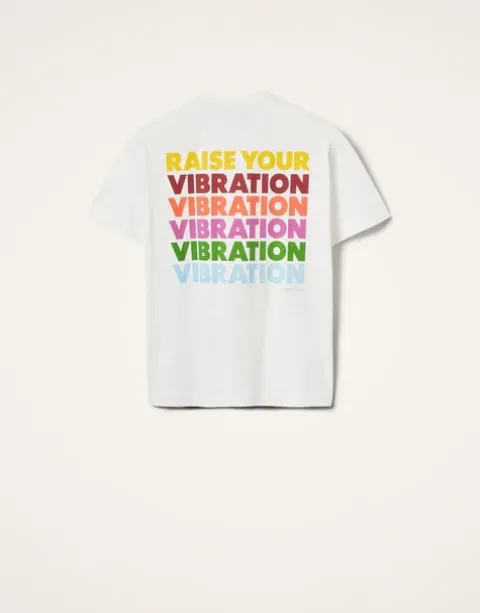 “Raise Your Vibration” is more than a motto here at La DoubleJ. It inspires everything we do – from the silhouettes we create, the colorful prints we design, the events we host, everything. Our goal is to lift you up and elevate your spirit to its highest peak possible. Crafted in our soft-as-silk 100% Italian jersey, this heart-opening tee arrives with our maximalist mission writ loud and proud across the back in glorious rainbow shades, while our Yin Yang JJ emblem sits over the heart on the front. Breathable and wrinkle-resistant, it can be worn whenever, wherever – under a suit jacket, over a swimsuit, to bed, to the bar. It’s also unisex so the entire crew can reach peak joy in this piece!
