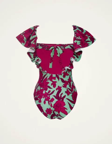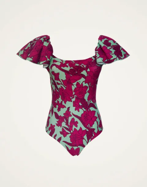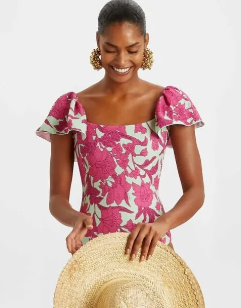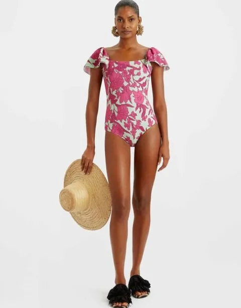 This suit is movie-star maximalism at its FINEST. Inspired by one of Hollywood’s most iconic badass babes, Scarlett O’Hara, this stunning one-piece brings romance to the Riviera with fluttering ruffled sleeves and a sleek square neckline. Doing double duty like the diva she is, this swimsuit is as breathtaking solo as it is worn under our voluminous Big Skirt for full Gone with the Wind gorgeousness.