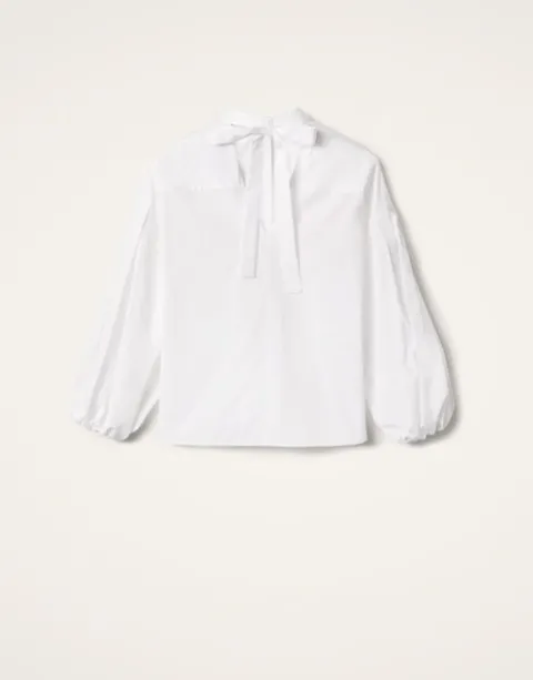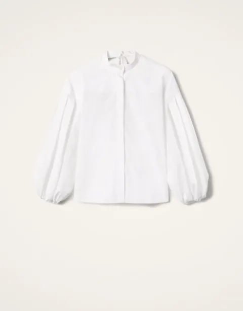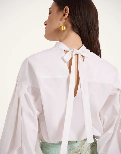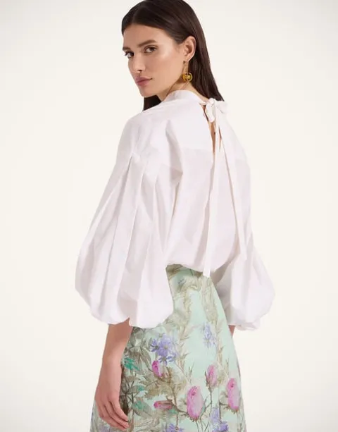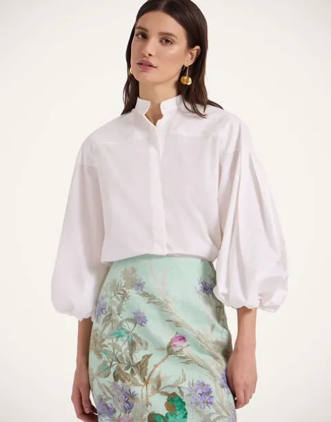 How’s about a sassy new separate to shake up your occasionwear wardrobe? This shirt features a Mandarin collar that falls to an open V at the nape of the neck for a polished in the front, party in the back situation. Crafted in our most structured cotton poplin to give those puff sleeves even more volume when you slide the elasticated cuffs up. Timeless in gleaming white cotton, there’s no doubt it’s a closet cornerstone whether you go classic with black pants for work or razz things up with our printed Pencil Skirt for some place more fancy.