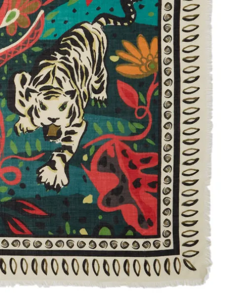 The number your neck never knew it needed. Cut from our crave-able combo of silk and wool, this slinky soft shawl is the ultimate all-seasons accessory, warm enough for your Winter walk, and light enough for Spring soirees. Cut in our wild Giungla, Camel Tiger Tiles, and Verde Tiger Tiles prints, she’s perfect for adding a pop of wild-cat color to a classic Fall coat, or as a fiercely fabulous in-flight throw for serious high-mile high vibes.