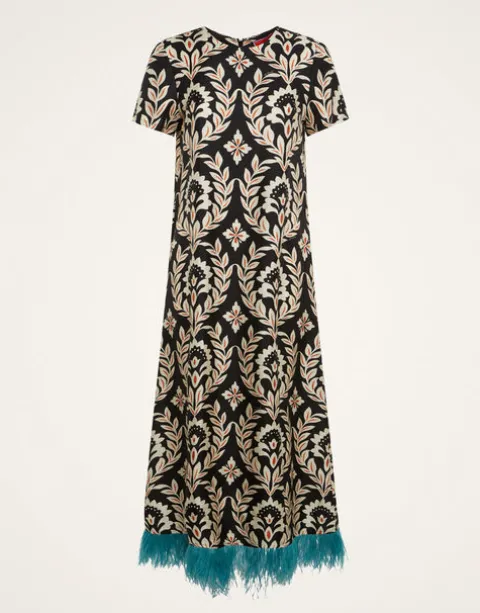You never forget your first love and this is the story of our Swing Dress. LDJ’s very first model, this easiest of silhouettes is cut slim in the shoulders, generous in the hips, to be adored by babes of all ages. Done in our fluid silk twill that doesn’t cling a bit, it’s finished with a fabulous contrast feather trim that honestly finds a fan club wherever you take it. With its understated T-shirt silhouette and this elegant Ghirlanda print, anything goes.