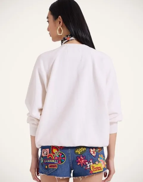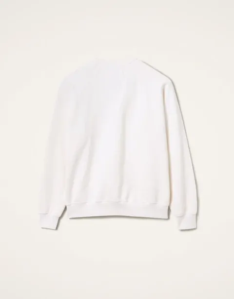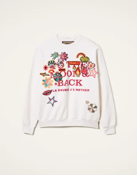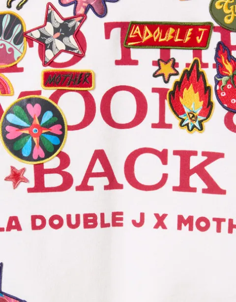 Our new sweatshirt obsession has just arrived courtesy of the Ciao Mamma! collaboration between La DoubleJ and MOTHER. A little bit oversized, a lot alluring, this closet staple features a crewneck, ribbed hems and a slightly cropped fit for a more retro, John Hughes silhouette. Made from 100% cotton in white, the sweatshirt has deep red text reading “TO THE MOON & BACK” surrounded by mood-boosting vintage-inspired patches – a nod to our love of love and 80s rom-com radiance.