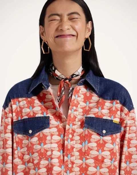 A Western-inspired denim button-up from La DoubleJ and MOTHER’s Ciao Mamma! collaboration, this shirt is equal parts wild and whimsical, arriving in a print starring LDJ’s first mood-boosting spirit animal, the dragonfly. Featuring patch pockets, a curved hem and snaps down the front, the drama is in the details of this one, a perfect marriage of American aesthetics and Italian tailoring.