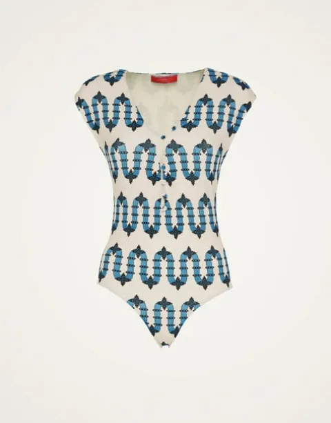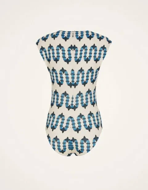 Part swimsuit, part bodysuit, the Tutto (as the name suggests) does it all. With a mini cap sleeve and and high -but-not-too-high cut hip, this is a bathing suit you can actually ride (and make) waves in. With buttons down the neckline you can make that V as deep or shallow as you wish. Gorgeous with pants and skirt, but of course she stuns solo also.