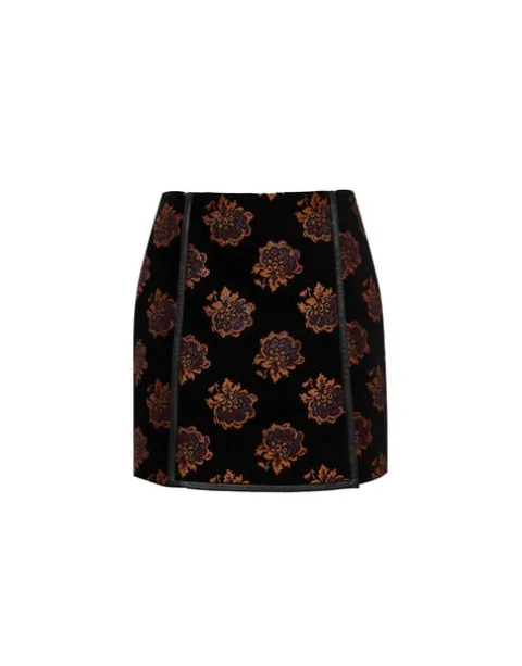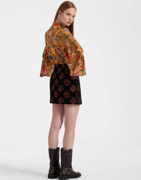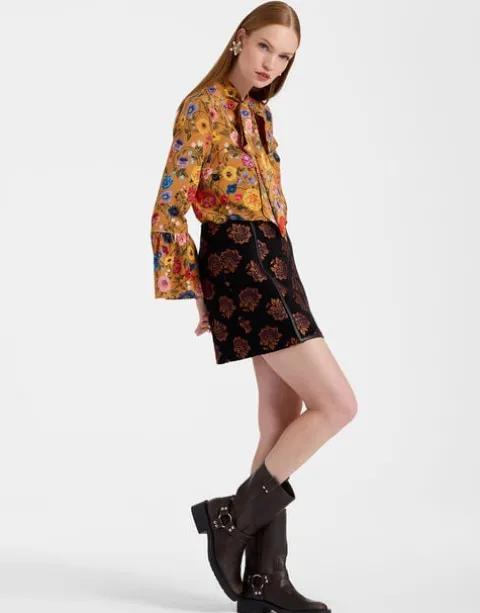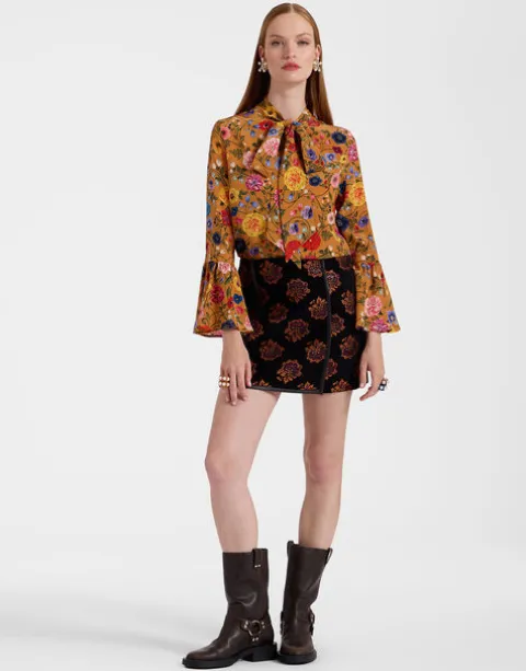 An ode to the swinging ‘60s icon, Twiggy, this panelled mini skirt is a nod to mod. A-line with a flirty front panel and slits on either side, this mini packs major mamma mia! punch. A piped leather border further elevates this already opulent beauty which, crafted in printed Italian jacquard, delivers double takes whether she’s worn with an oversized sweater or our romantic Foulard Shirt and heels.