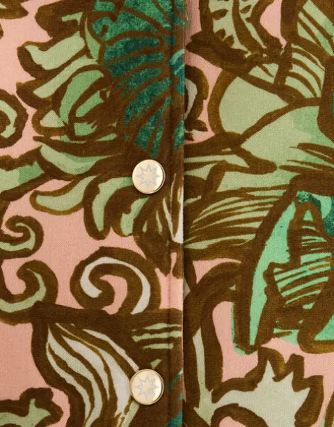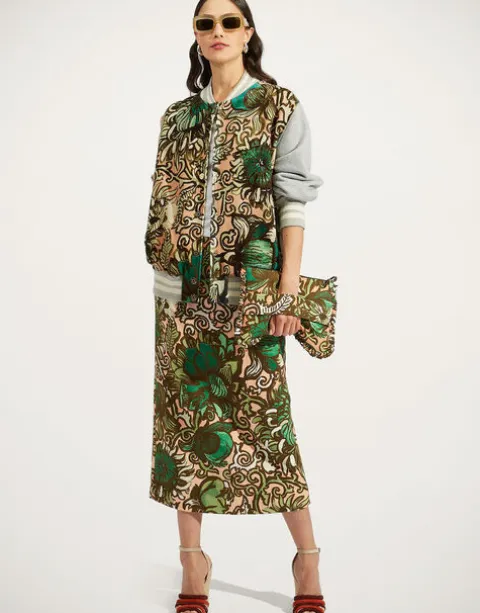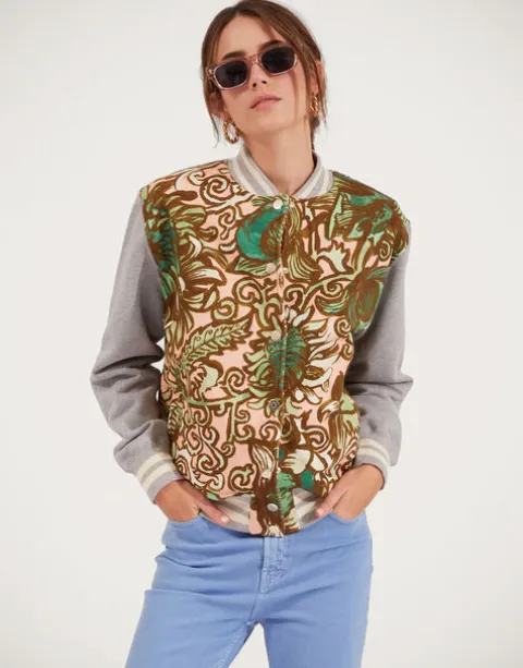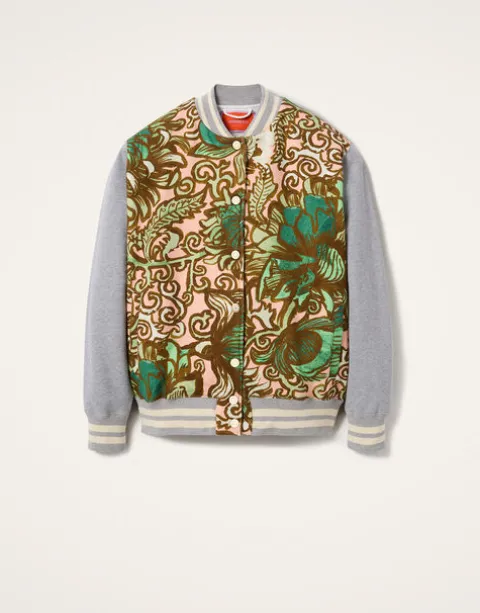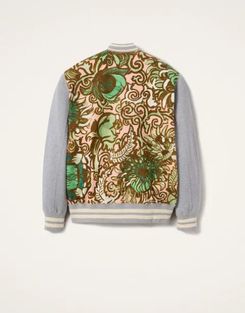 Brat Pack, eat your heart out. This varsity jacket is a modern update on the iconic John Hughes era look, with a statement printed body and solid sleeve, with a striped cuff, collar, and hem. Slightly oversized for that androgynous off-duty model look, this is a piece the entire LDJ team covets, with our custom starburst insignia emblazoned on all of the buttons. Cut in our soft Italian felpa, this piece is the perfect light layer for Spring and Summer. Lean into the print perfection by pairing your jacket with its matching patterned leggings or skirt, or keep it classic with jeans and some badass boots.
