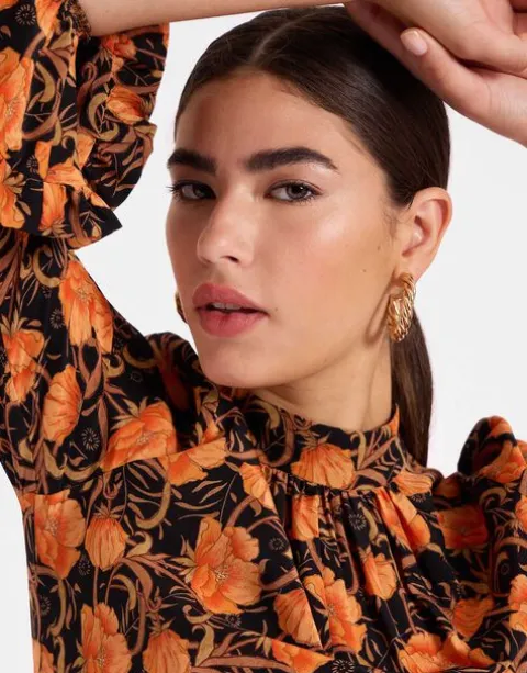 An evening dress inspired by Italy’s chicest family – palazzo not required. Crafted in our ultra-luxe silk crepe de chine that flutters and flows, this fiercely feminine beauty arrives in the LDJ original floral Morpheus print. Floor length with a single ruched tier in the skirt, it has a mock neck with ruching around the décolleté, slightly gathered shoulders and sleeves that end in frilled bells. Prepare to be beguiling!
